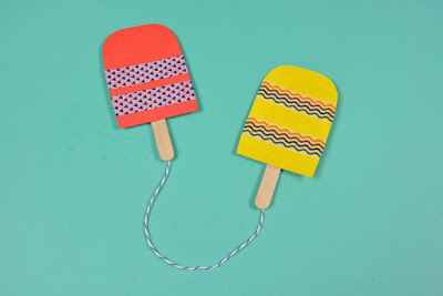 4.- Pega el washi tape en los helados. Si tienes más de un motivo puedes combinarlos y vas a cortar un pedazo de hilo dependiendo del largo que quieras darle a tu marcalibros.